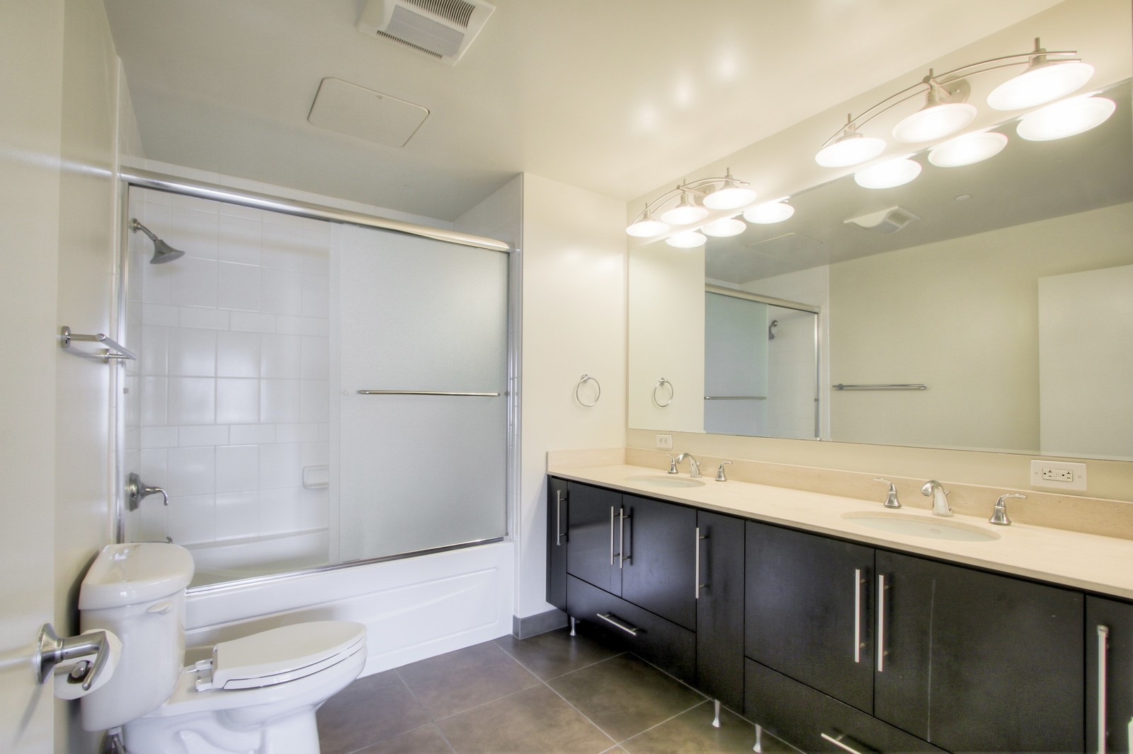 As you enter the condo you’re greeted with a warmly-lit entry with beautiful warm wood floors, which continue into the living area and kitchen. There is a large entry closet with organizers. The primary suite is spacious and features dual closets with custom organizers. The windows in the condo all have full-length shades – black-out shades in the bedrooms and light-filtering shades in the living space. The large primary bath has a dual-sink vanity with a natural stone counter, a tile surrounded shower over tub, and a tile floor.