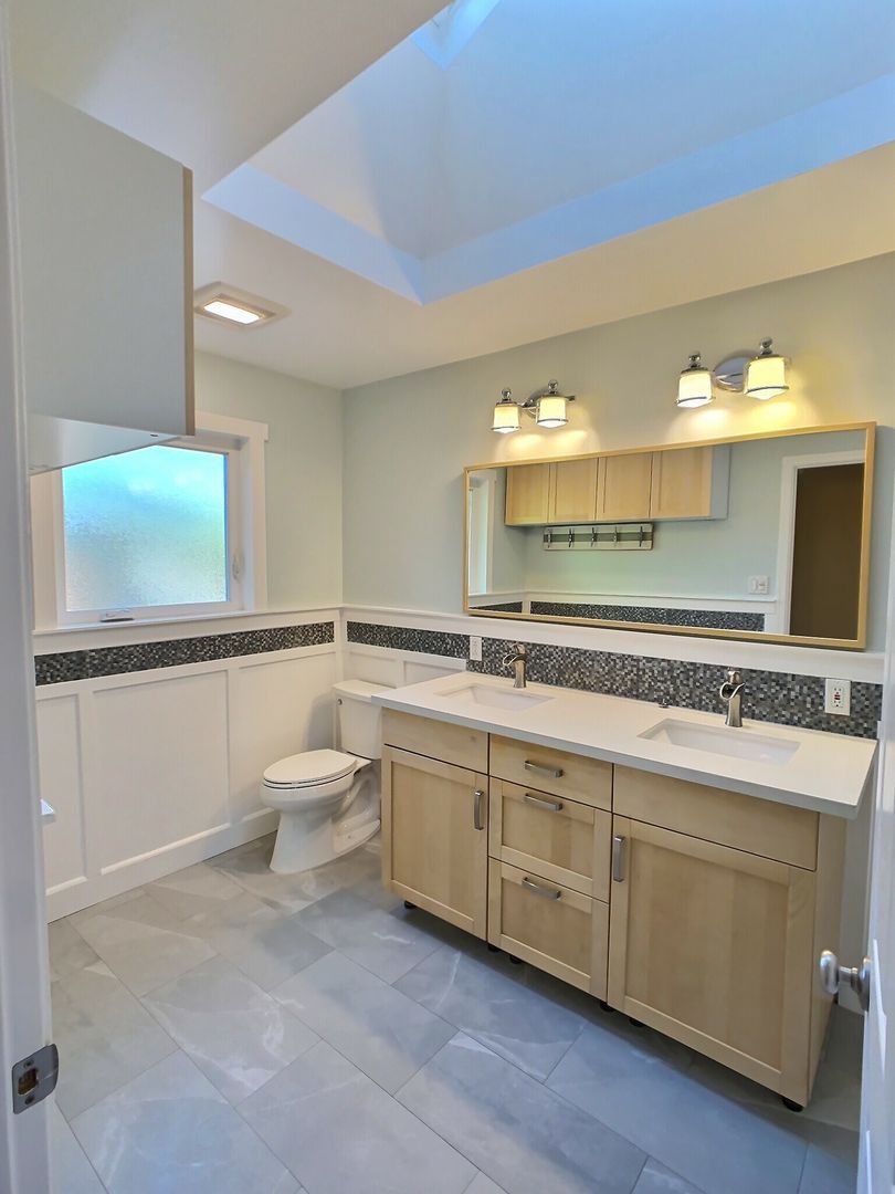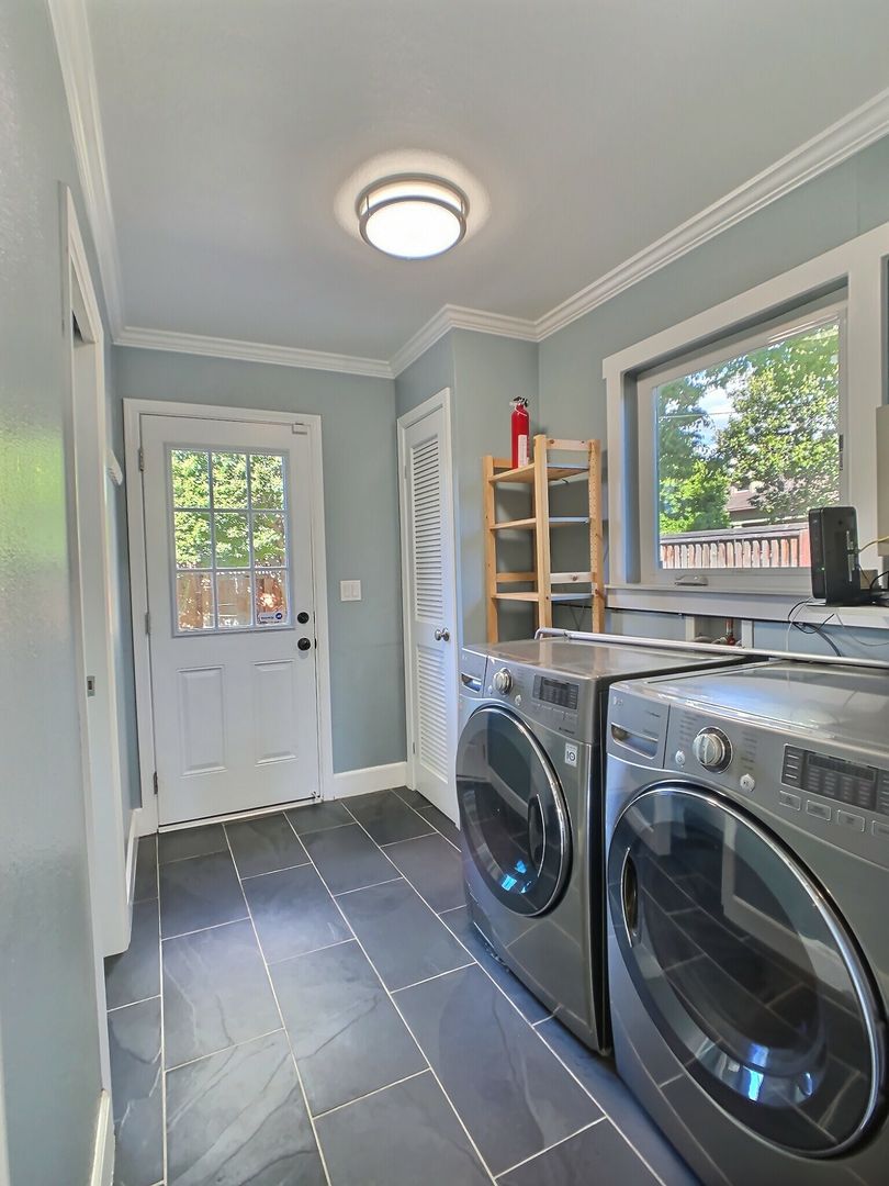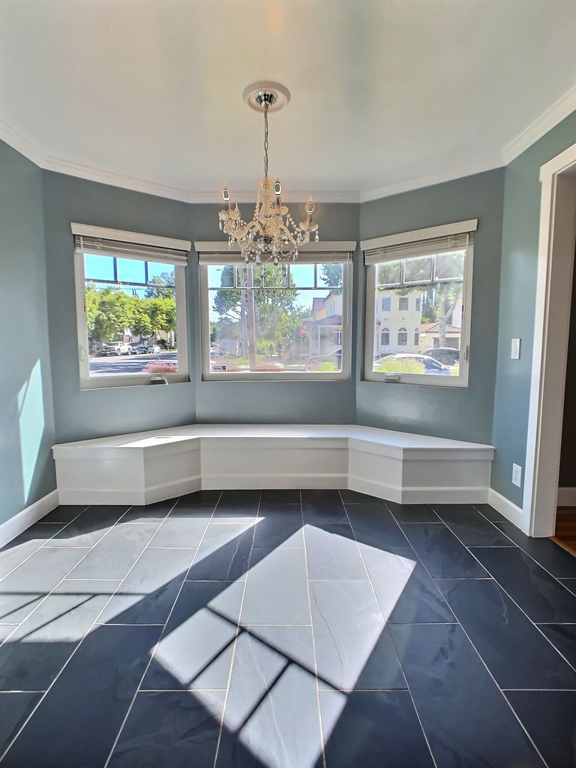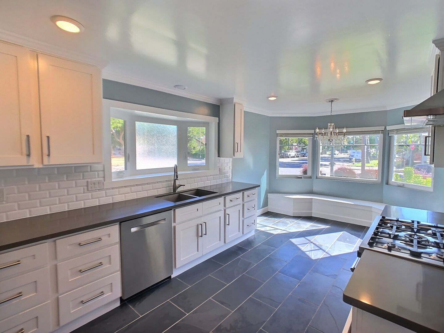 Heading toward the kitchen is a separate dining room. The updated kitchen features a breakfast nook with built-in bench seating, natural stone counters with a subway tile backsplash, and stainless-steel appliances, including a professional-grade gas range. Off the kitchen is a laundry room with full-sized washer & dryer, and access to the backyard. There is a full bath with a walk-in shower.