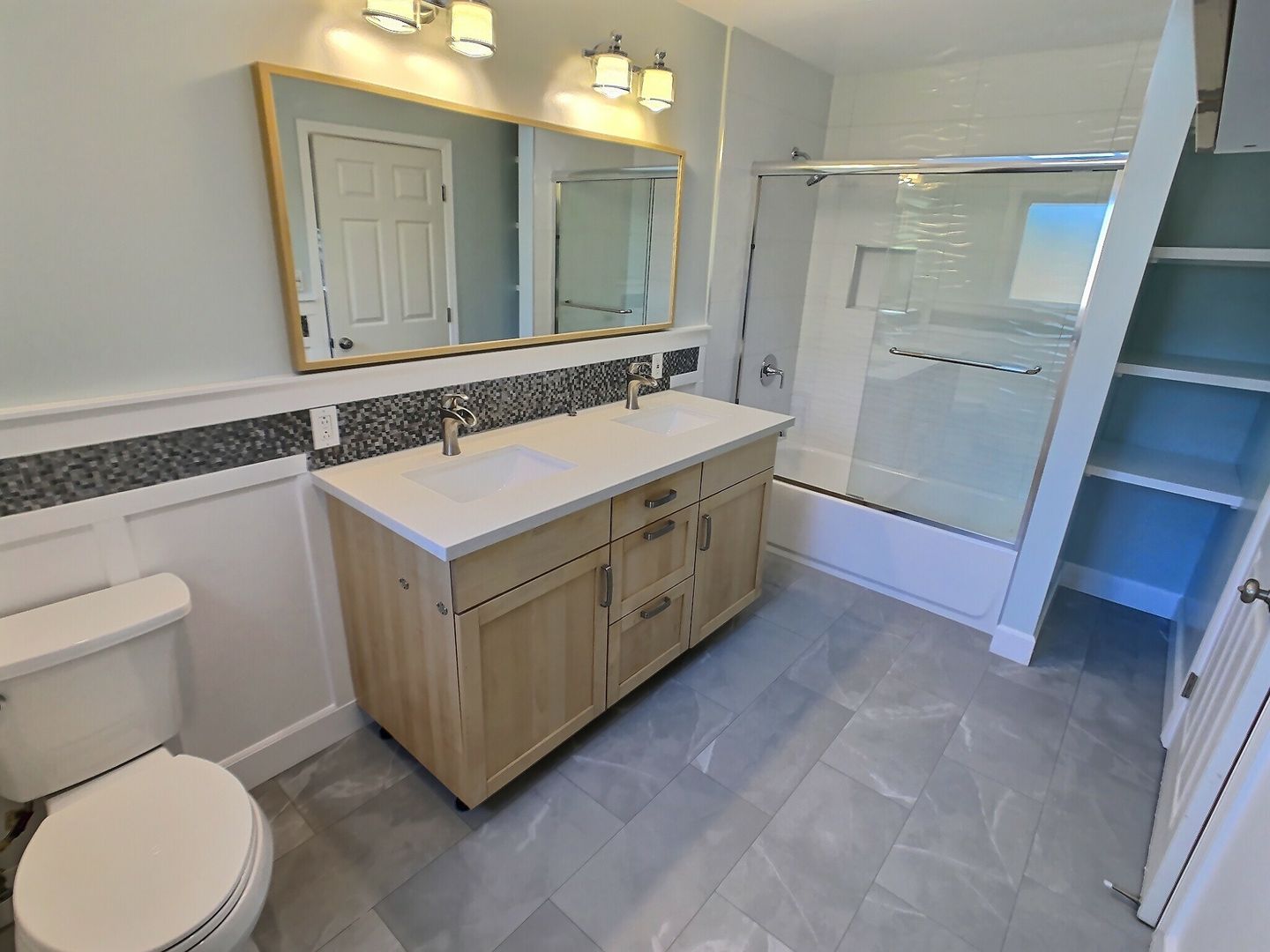 The primary bedroom suite has a large closet with custom organizers and a sliding patio door that leads to the beautiful backyard. The main bathroom has recently been remodeled and includes a lovely, tiled tub/shower with plenty of storage space.